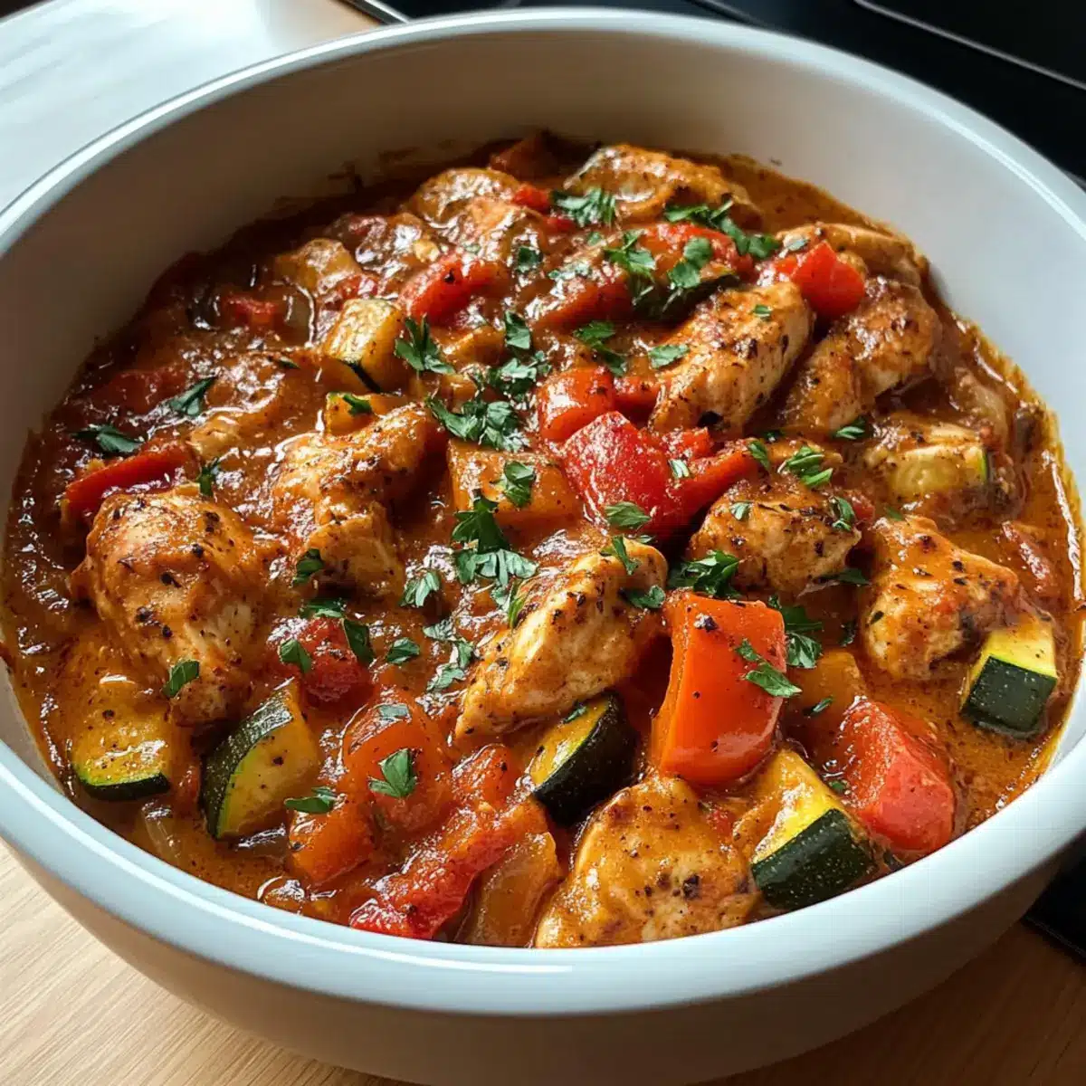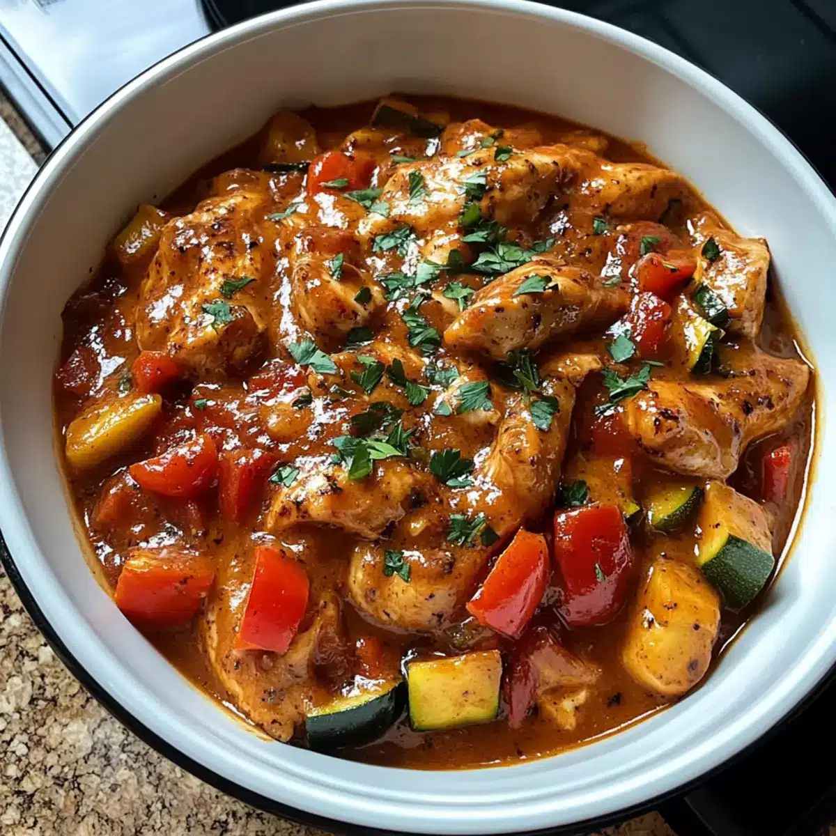 Achten Sie darauf, frisches Gemüse zu wählen. Für Paprika sollten die Schalen glatt und glänzend sein, ohne dunkle Flecken oder Druckstellen. Zucchini sollte fest und gleichmäßig gefärbt sein. Das Hühnchen sollte rosa und feucht, aber nicht glitschig sein – eine gute Qualität ist unerlässlich für einen herzhaften Mafia Topf!