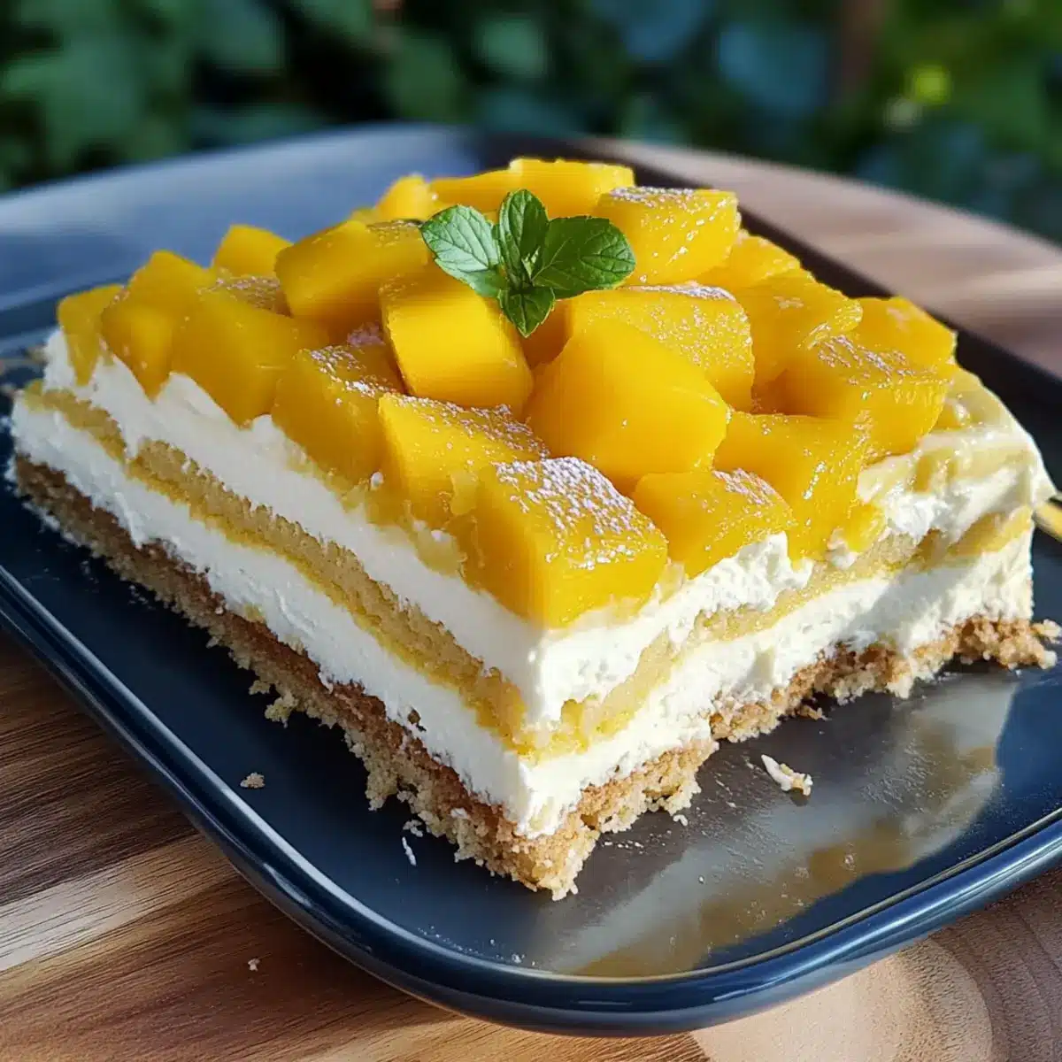 - Serviere das Mango Tiramisu kalt mit einem Zweig frischer Minze.