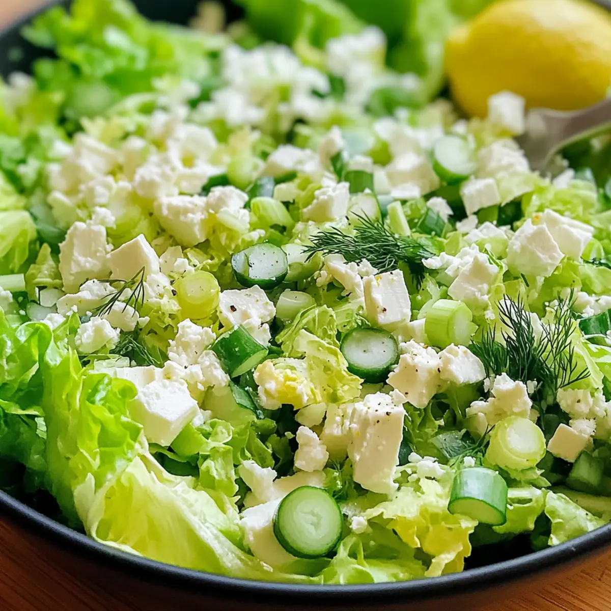 - Salatzutaten kombinieren: In einer großen Schüssel gib die gut getrockneten Salatstücke, die fein gehackten Frühlingszwiebeln, den frischen Dill und den zerbröckelten Feta-Käse.
