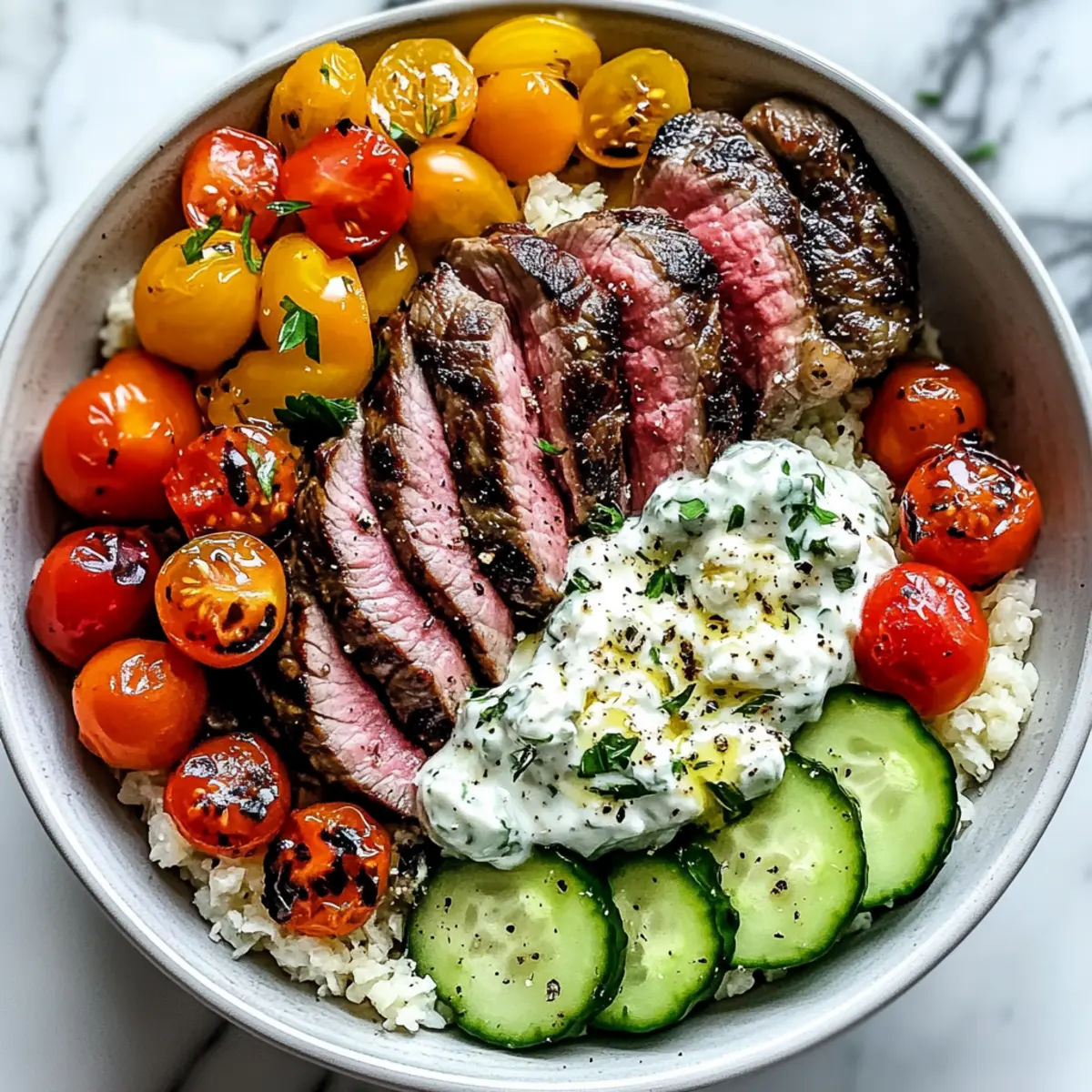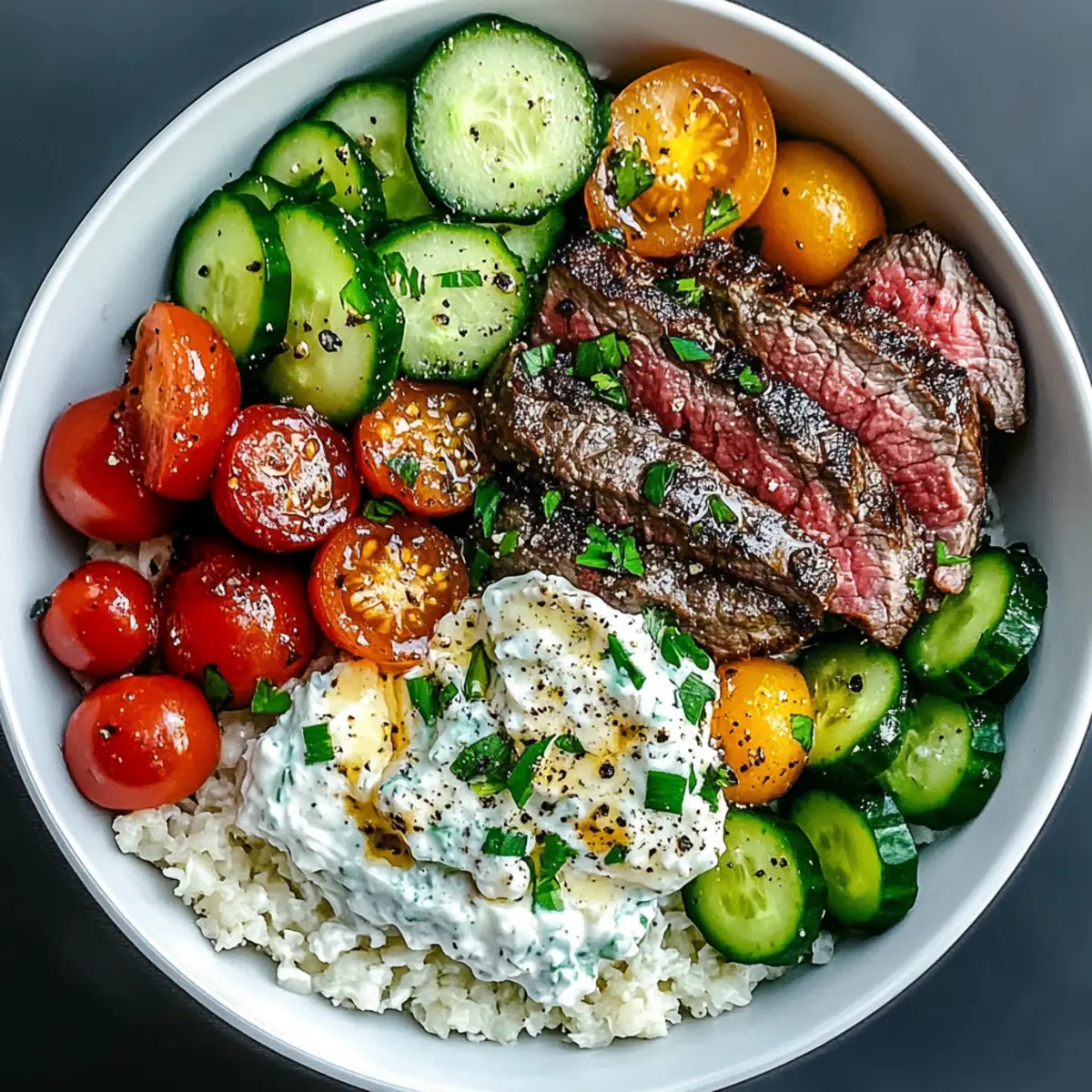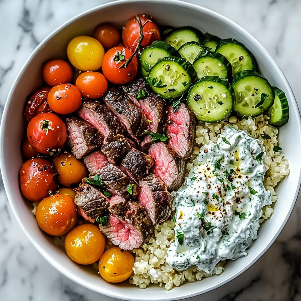 Einzigartige Aromen: Die Kombination aus mariniertem Sirloin-Steak und cremiger Tzatziki bringt die lebendigen Geschmäcker des Mittelmeers direkt auf deinen Tisch. Anpassungsfähigkeit: Egal, ob du eine ketogene oder pflanzliche Ernährung bevorzugst, du kannst die Zutaten problemlos anpassen und variieren. Einfachheit: Die Zubereitung ist unkompliziert und erfordert nur grundlegende Kochfähigkeiten, perfekt für entspannte Abende. Gesund und sättigend: Mit einer Mischung aus Proteinen, gesunden Fetten und frischen Gemüse ist dieser Bowl nicht nur lecker, sondern auch nahrhaft. Farbenfrohe Präsentation: Diese Mediterraner Steak-Bowl sieht nicht nur fantastisch aus, sondern macht auch bei jedem Familienessen Eindruck. Probiere auch unser Rezept für griechische Tzatziki für den perfekten Geschmack!