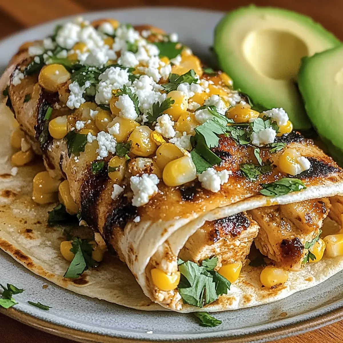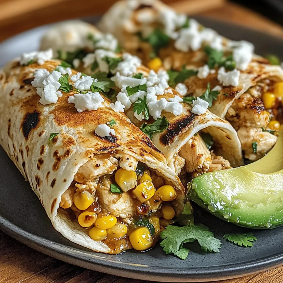 Legen Sie eine großzügige Portion der Hähnchen- und Maismischung in die Mitte jeder Tortilla. Mit zerbröckeltem Cotija-Käse, frischem Koriander und optionalen Avocadoscheiben garnieren. Wickeln Sie die Tortilla um die Füllung und drücken Sie die Seiten leicht zusammen, um die Wraps zu schließen.