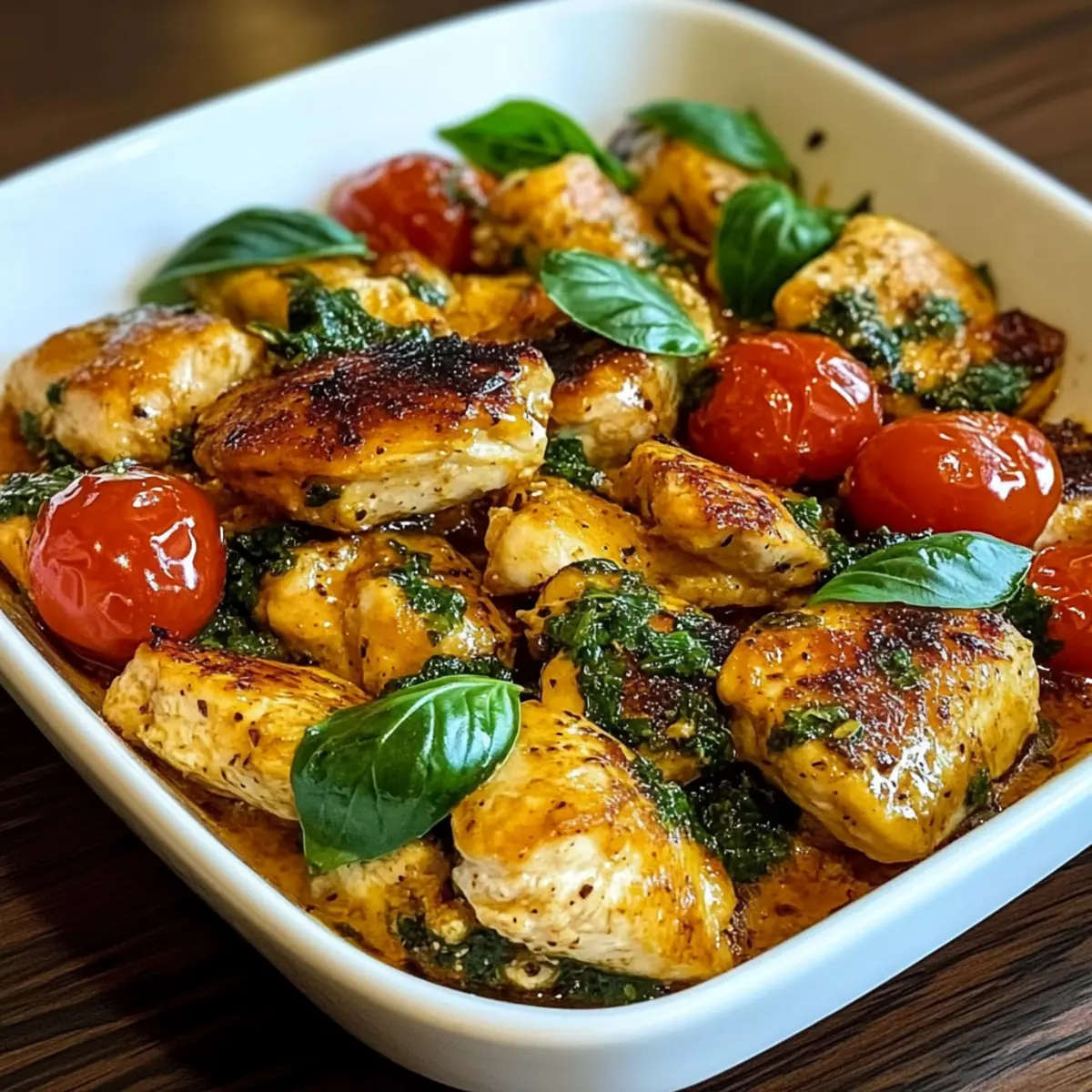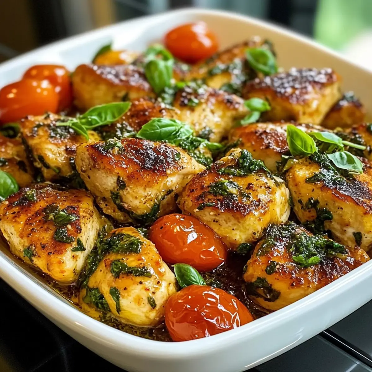 Nehmt die Pfanne vom Herd und faltet frisches Basilikum vorsichtig unter das Hühnchen und die Tomaten. Serviert das Gericht warm auf einem Teller oder in einer Schüssel, optional mit zusätzlichen Kräutern oder Zitronenscheiben zur Garnierung für einen einladenden Anblick.