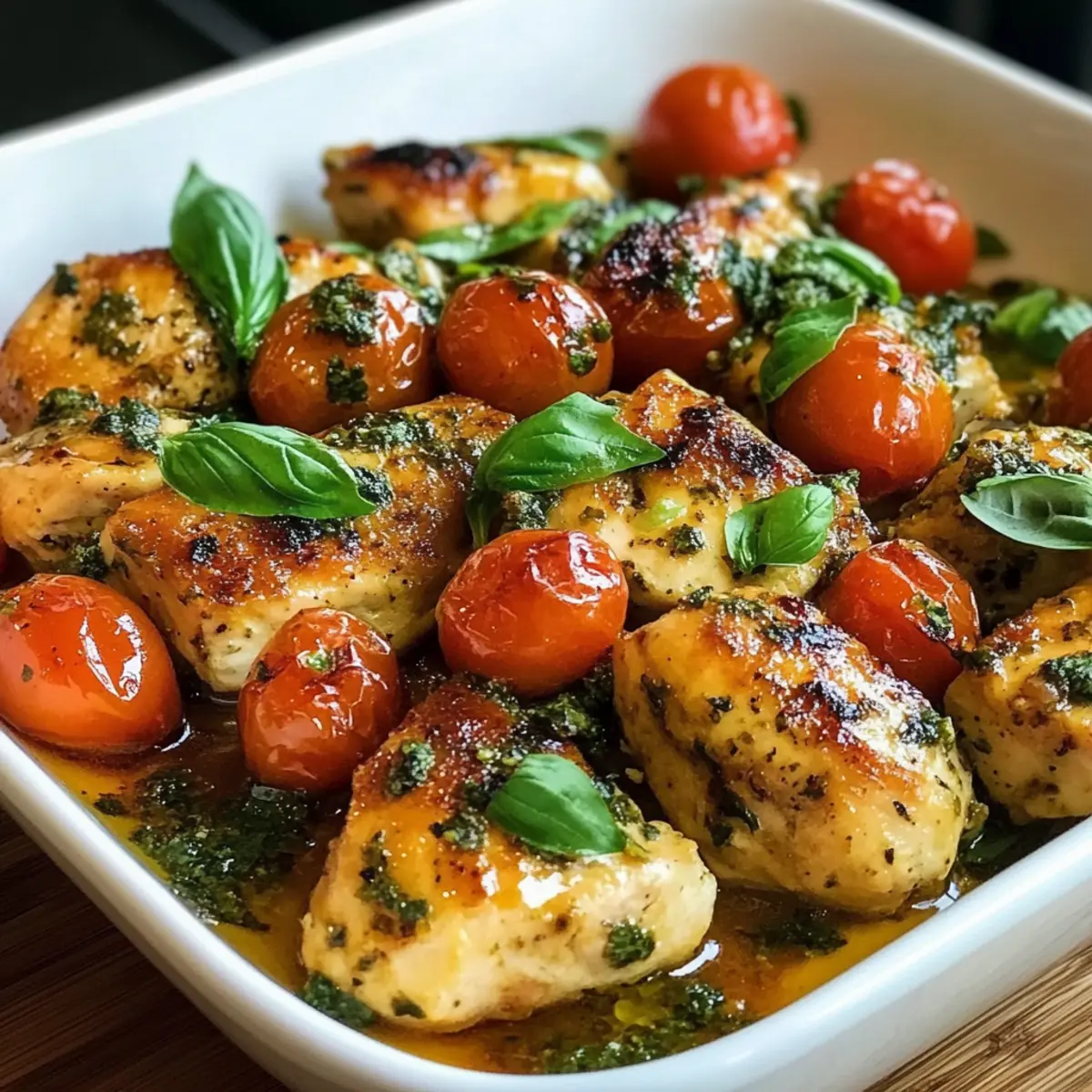 - Frisches Basilikum unter das Hühnchen und die Tomaten falten und servieren.