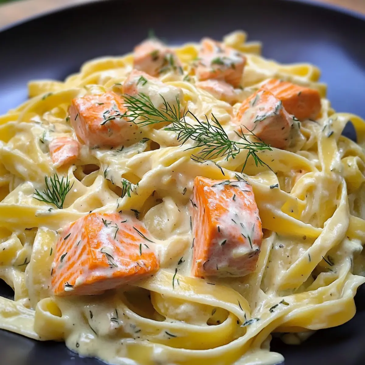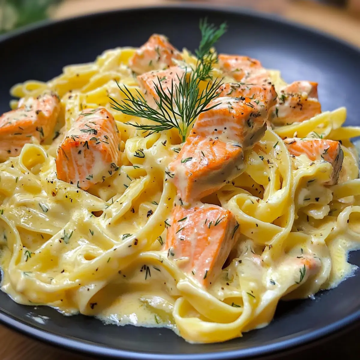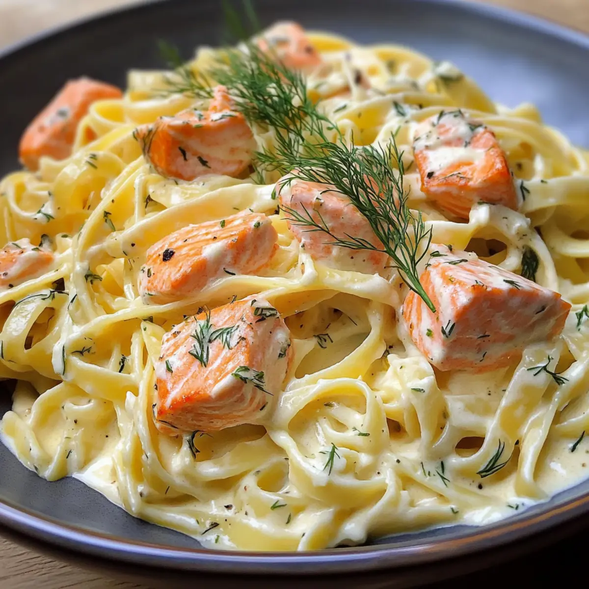 - Serviere die Pasta mit Lachs und Sahnesoße heiß und garniere eventuell mit frischem Dill.