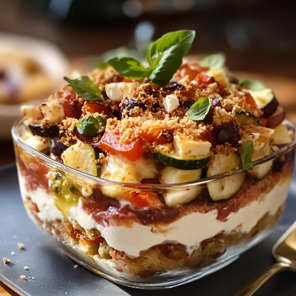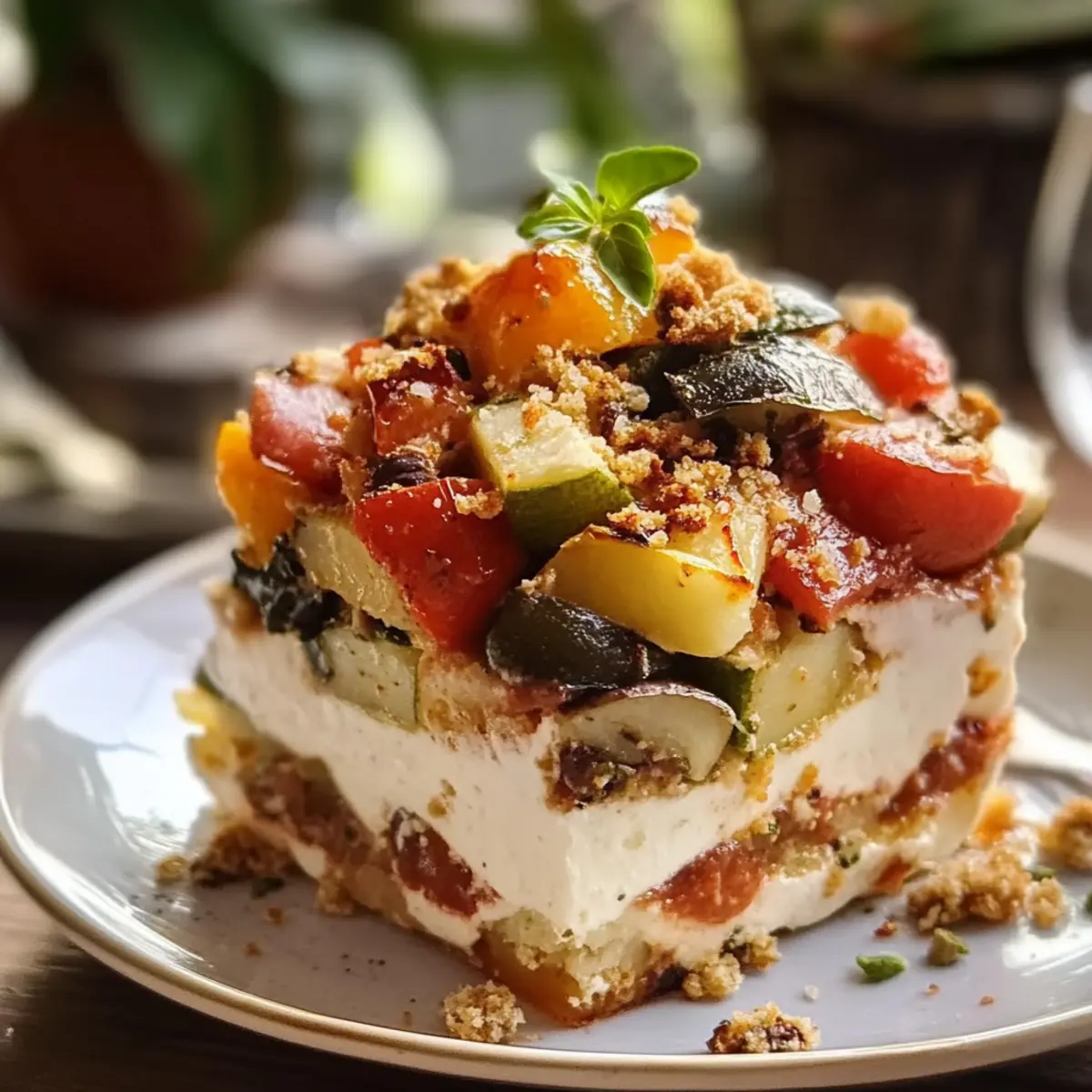 Einzigartiger Genuss: Dieses pikante Antipasti Tiramisu überrascht mit seiner Kombination aus cremigem Frischkäse und aromatischen, gerösteten Gemüsesorten.
