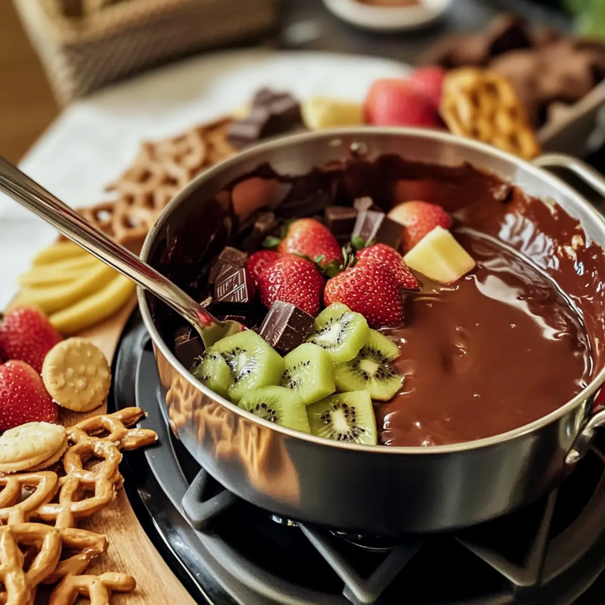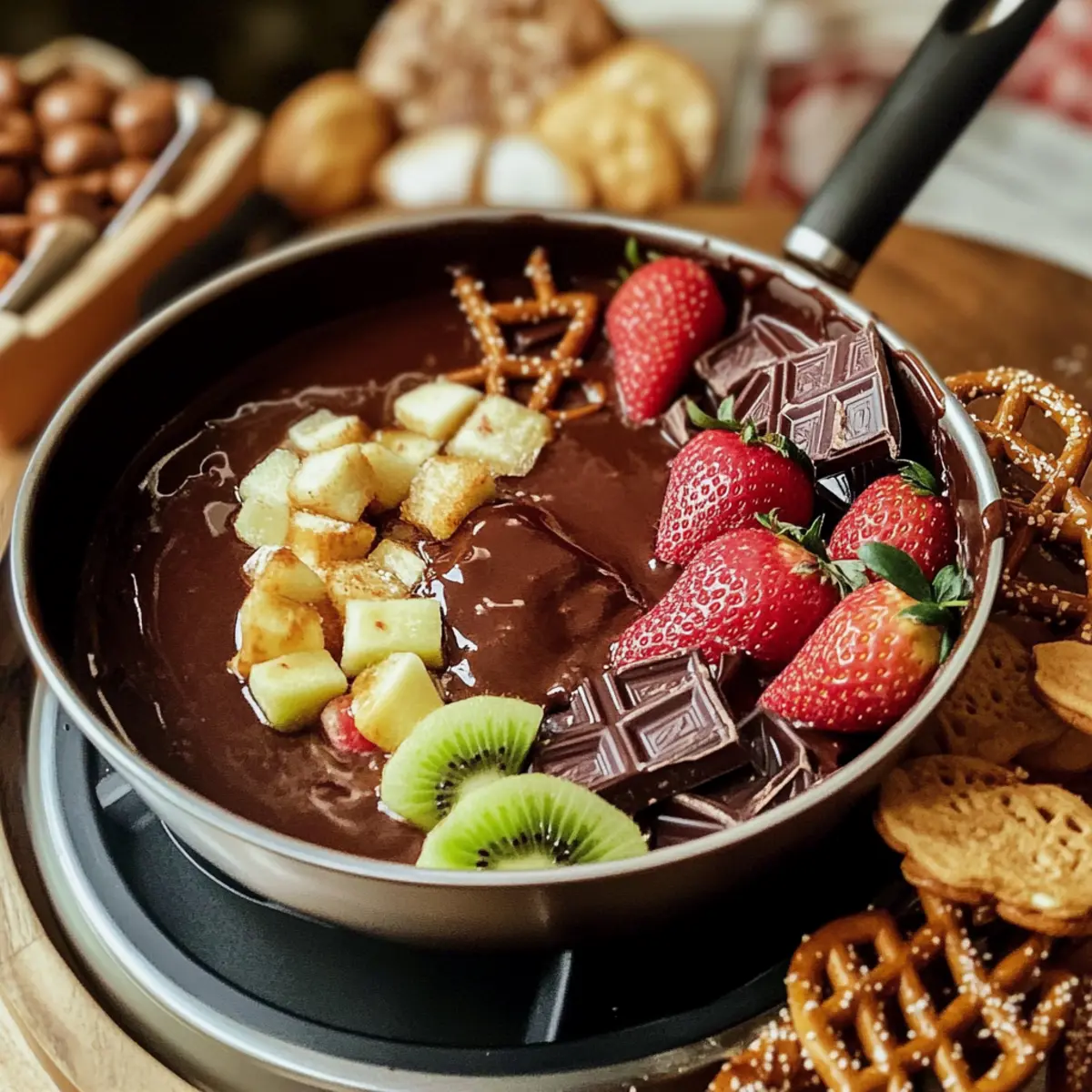 Die Dunkelheit des Schokoladenfondue-Topfes glitzert verführerisch und verspricht süße Abenteuer. Ob bei festlichen Anlässen oder entspannten Abenden mit Freunden, dieses Rezept für Schokoladenfondue bringt nicht nur eine köstliche Mischung aus Zartbitter- und Vollmilchschokolade auf den Tisch, sondern auch gutes Essen und gesellige Runden. Ein weiterer Pluspunkt: Es ist kinderleicht zuzubereiten und lässt sich individuell mit frischen Früchten und knusprigen Snacks anpassen. So wird jedes Dippen zu einem besonderen Erlebnis! Neugierig darauf, wie Ihr Abend mit einem eigenen Fondue zum Schokoladentraum wird? Lassen Sie uns starten!