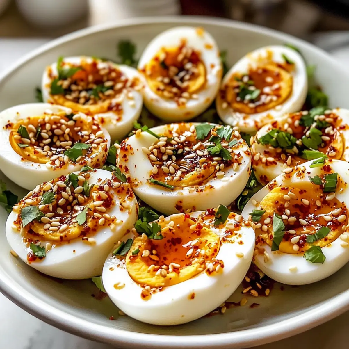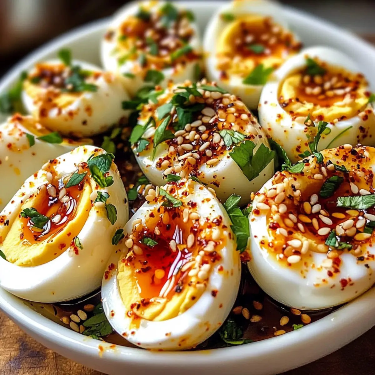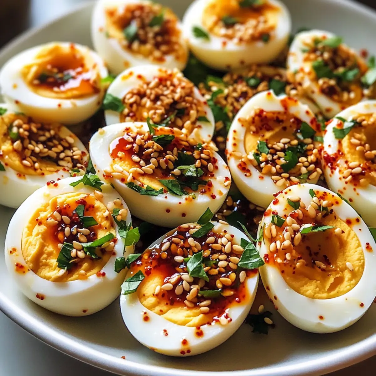 Träufle etwas mehr Chili-Knoblauch-Öl über die gefüllten Eier und streue die Sesamkörner gleichmäßig darüber. Wenn du magst, füge frisch gehackte Kräuter wie Schnittlauch oder Koriander hinzu, um eine Farb- und Geschmacksnote zu verleihen. Diese Garnierung verstärkt nicht nur das Aussehen, sondern auch den aromatischen Eindruck der Scharfen Chili-Knoblauch gefüllten Eier.