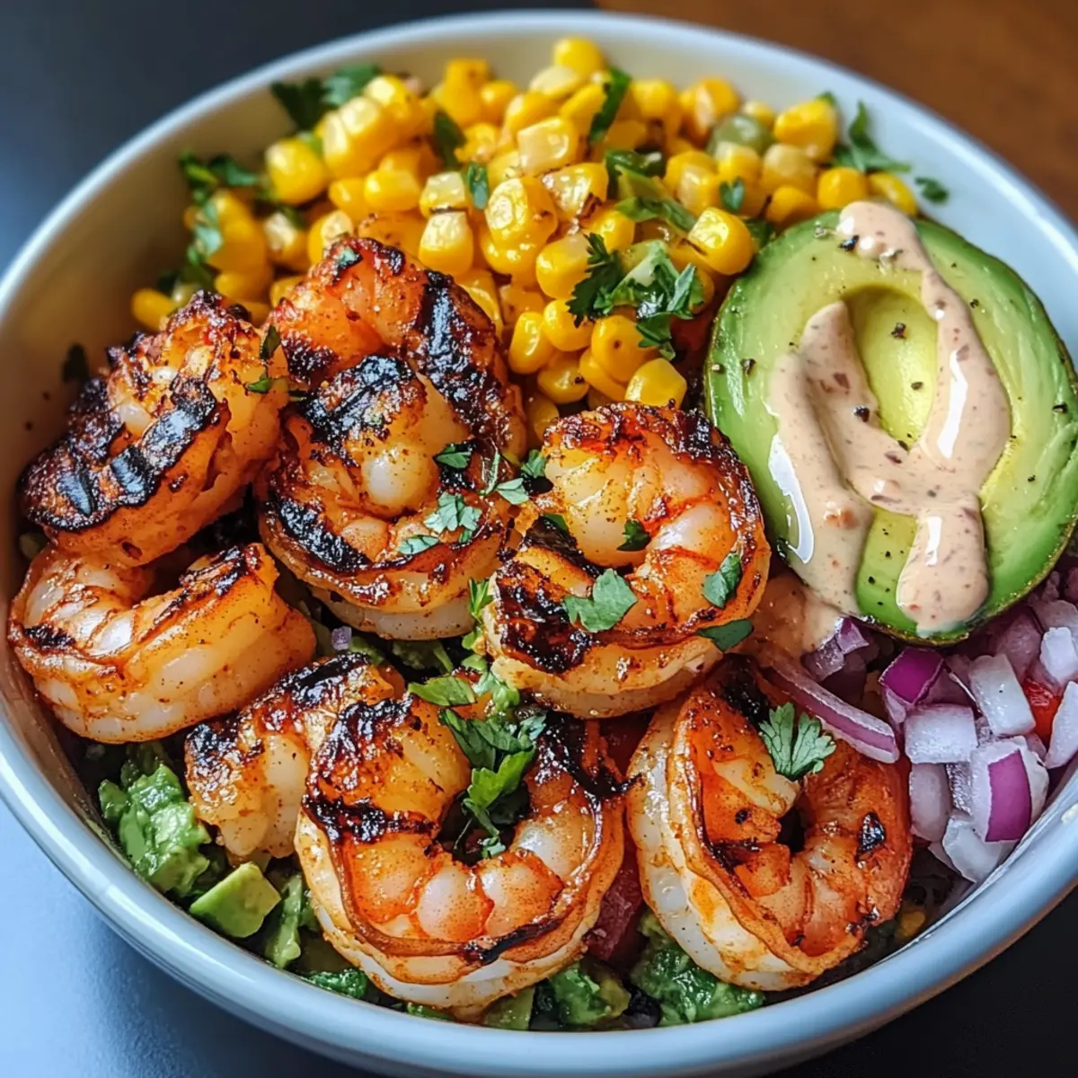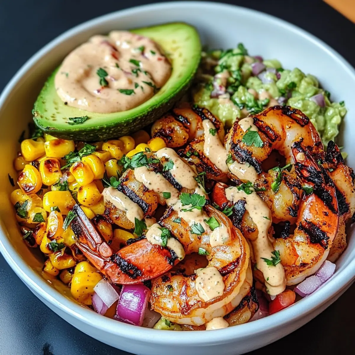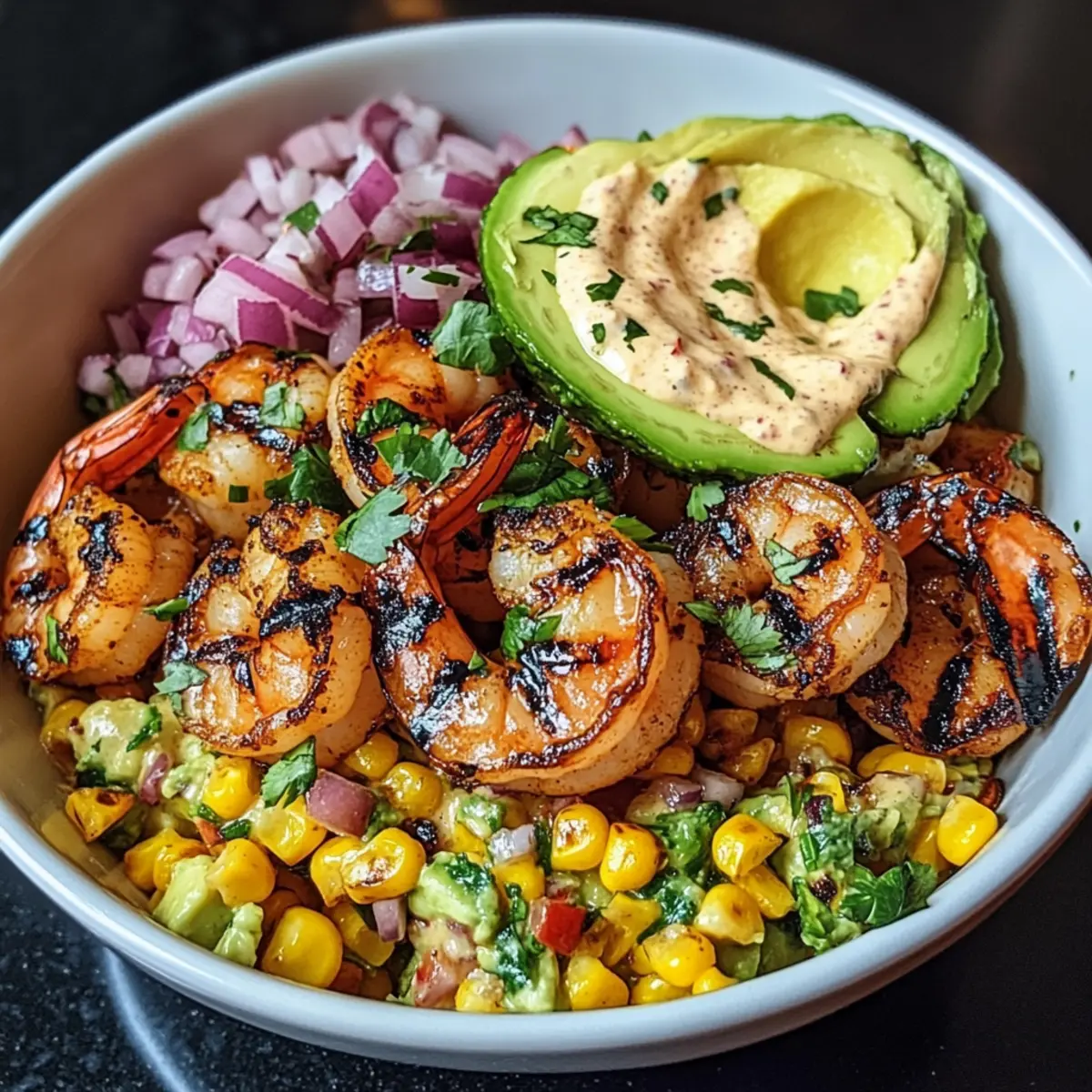 Leckere Shrimp Schüssel mit Avocado und Salsa