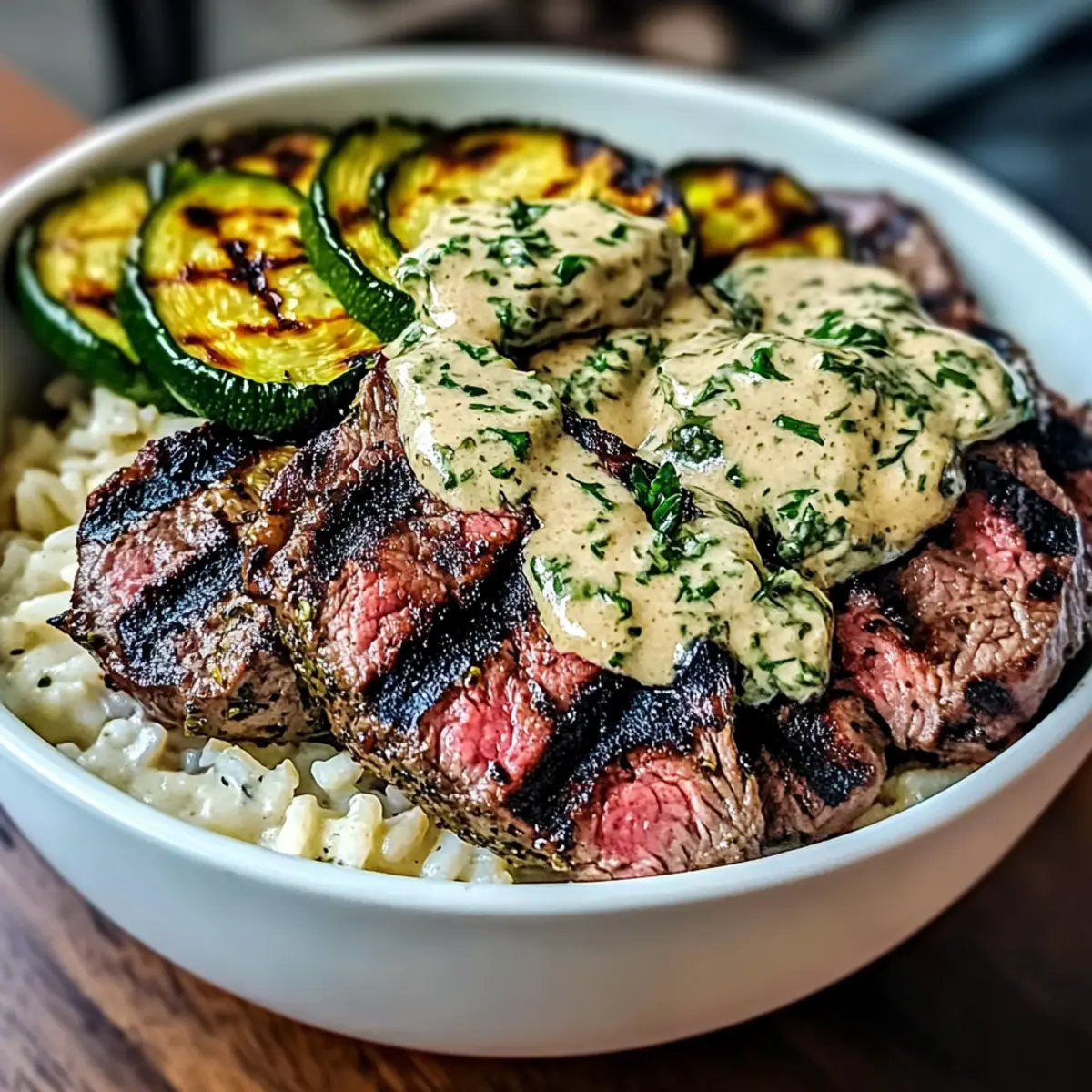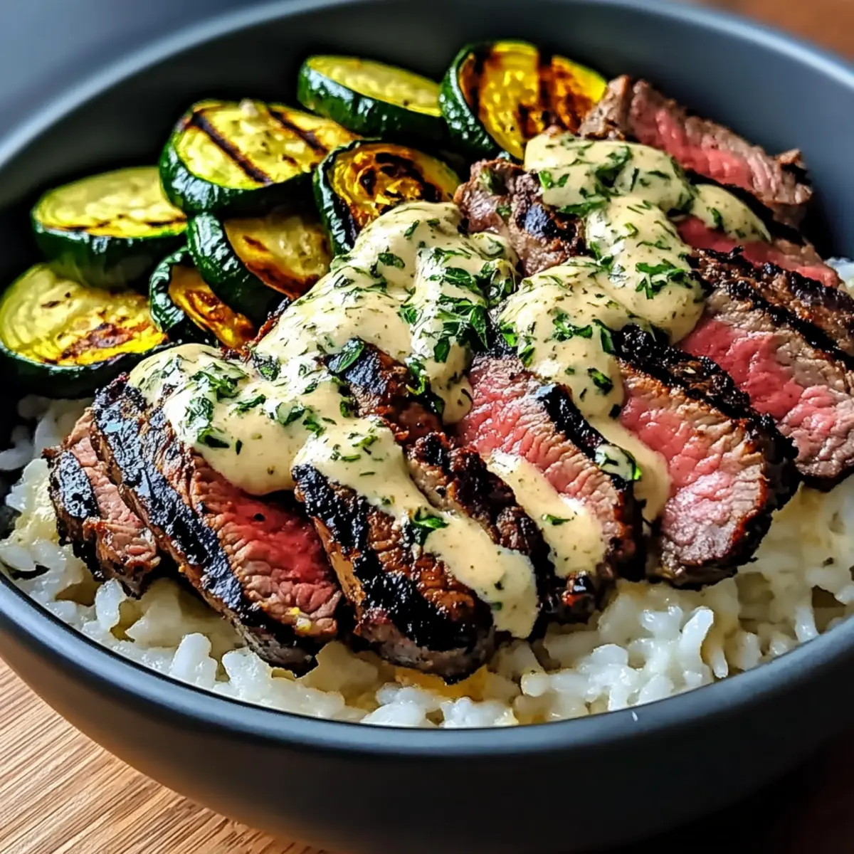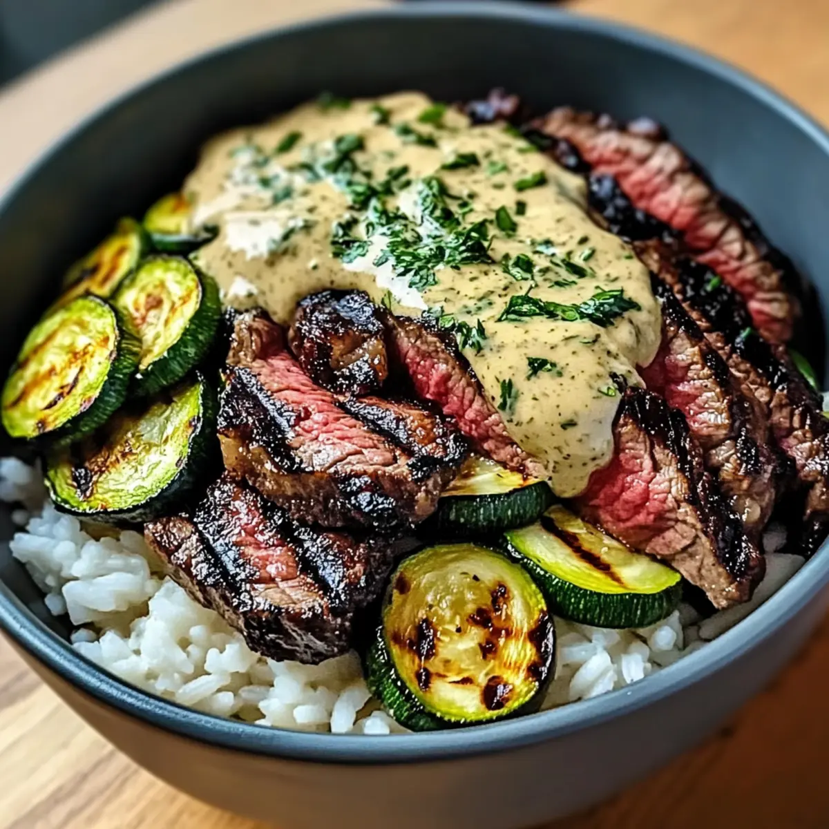 - Eine großzügige Schicht Gekochter Reis oder Kartoffelpüree in eine Schüssel geben, gefolgt von Zucchini und Steak. Die cremige Kräutersauce darüber träufeln.