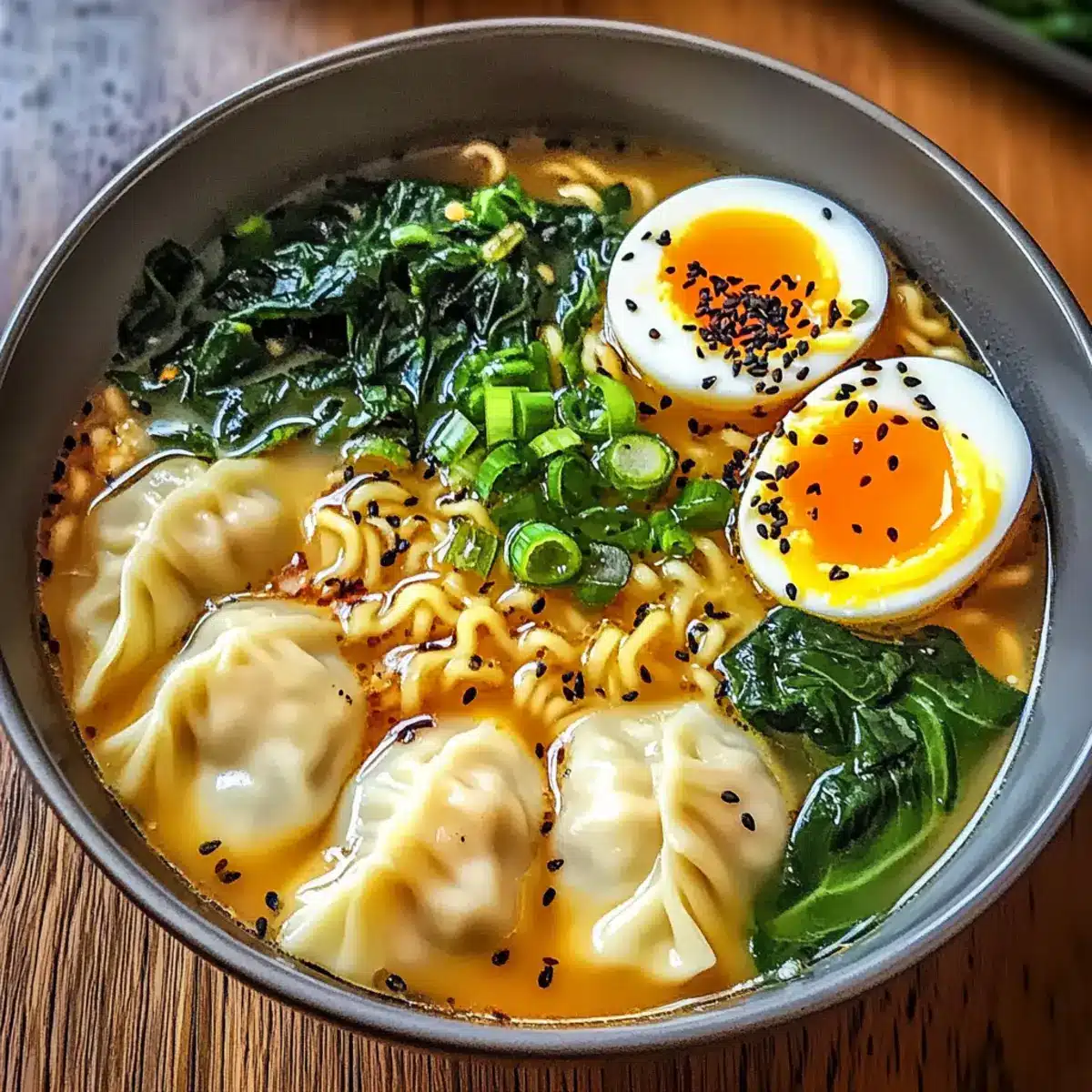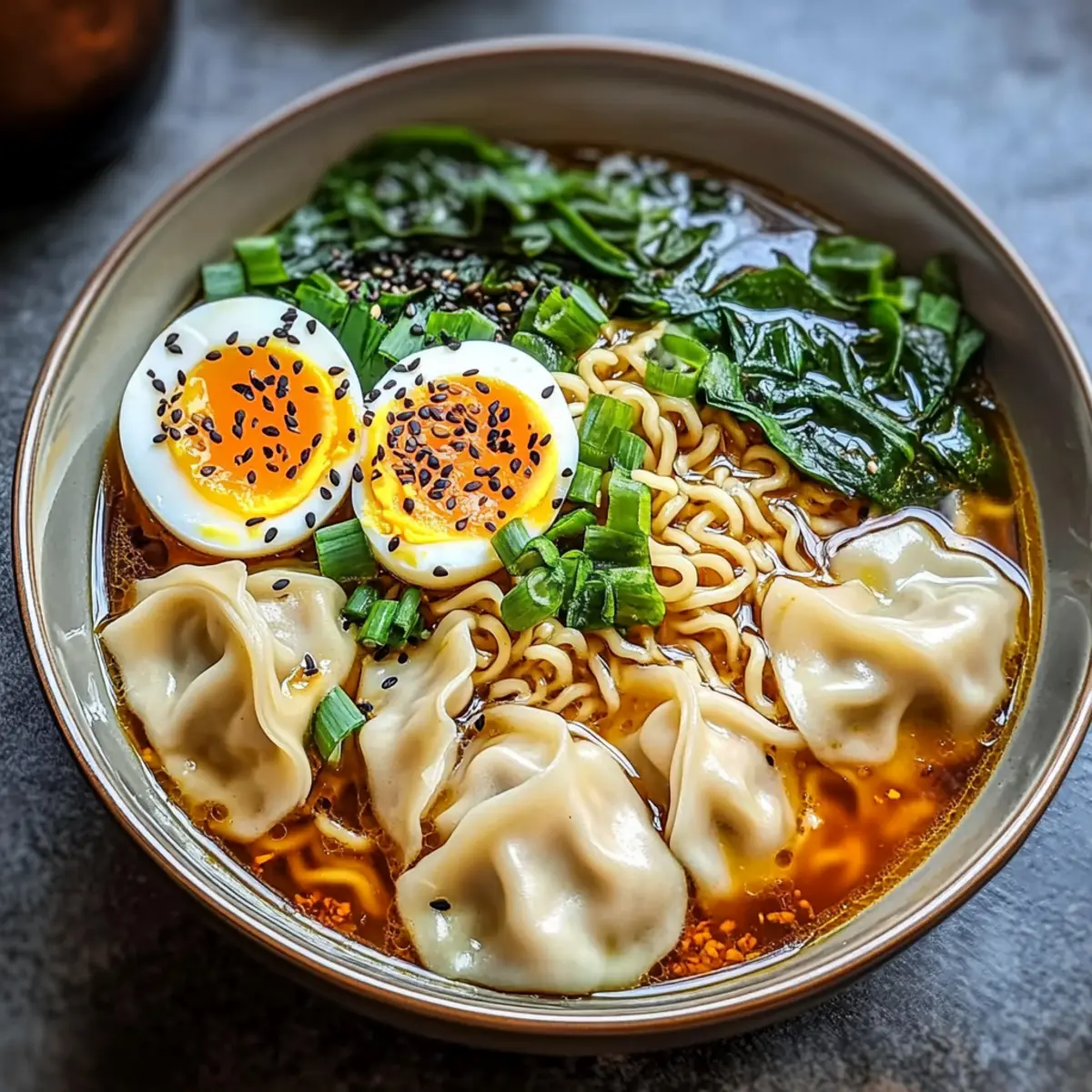 Simpel und schnell: Diese Teigtaschen Ramen Schüssel ist in wenigen Schritten zubereitet und benötigt keine komplizierten Kochkenntnisse. Vielseitig: Mit verschiedenen Teigtaschen und Brühen kannst du das Rezept ganz nach deinem Geschmack gestalten. Aromatischer Genuss: Die Kombination aus würziger Brühe und zarten Teigtaschen schafft ein unvergleichliches Geschmackserlebnis. Gesunde Zutaten: Frischer Spinat sorgt für Farbe und Nährstoffe, während du die Kochzeit mit instant Ramen optimierst. Begeisterte Gäste: Perfekt für gesellige Abende, wenn du Freunde oder Familie verwöhnen möchtest! Entdecke auch Weitere Variationen für dein Ramen und passe dieses Rezept an deine Vorlieben an.